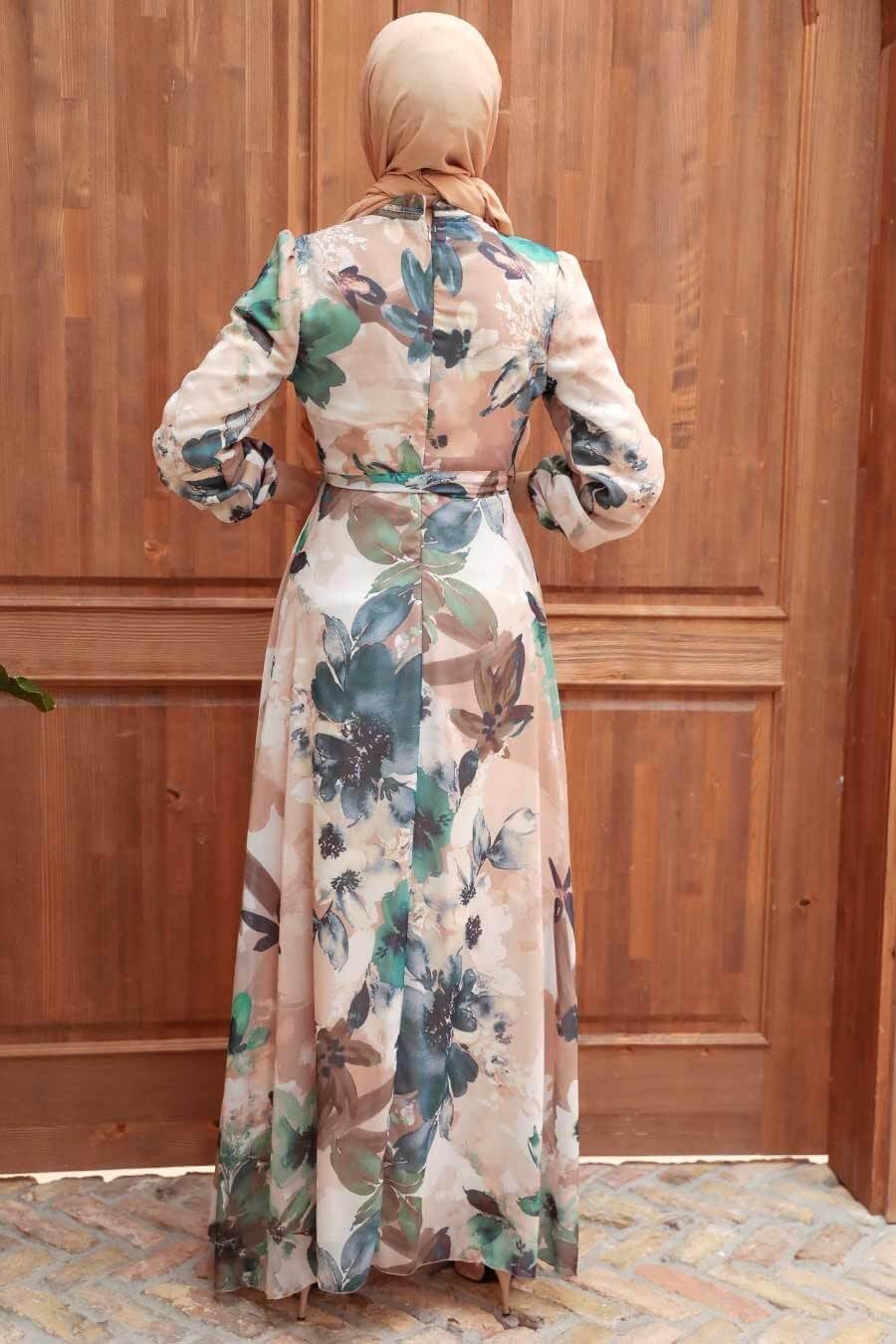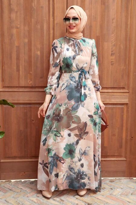 Modest Floral Dress - Beige & Green