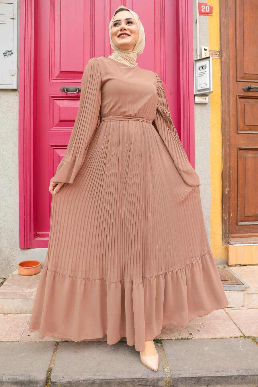 Modest Pleated Flare Dress Bell Sleeves - Dark Pink