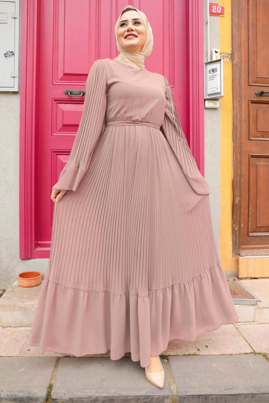 Modest Pleated Flare Dress Bell Sleeves - Pink
